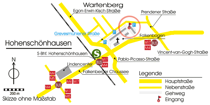 - Bus: 197, 154, X54 (S-Bhf-HSH oder Falkenberger Chaussee / Prendener Str.)